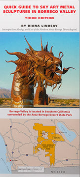 A map and guide to the 28 sites in Borrego Valley, CA, where life-size metal sculptures are displayed in a desert landscape surrounded by the Anza-Borrego Desert State Park. The folded laminated pocket guide has 16 4x5-inch panels with brief representative descriptions of the 131 individual sculptures. Sculptor Ricardo Breceda’s “Sky Art” is the perfect blend of stunning craftsmanship and placement in open desert landscape. From science to history and nature, the sculptures have evolved into whim and fantasy – something for everyone on this large desert palette. Sculptures include Plio-Pleistocene animals that once roamed this desert, Spanish explorers, bighorn sheep and dinosaurs.