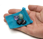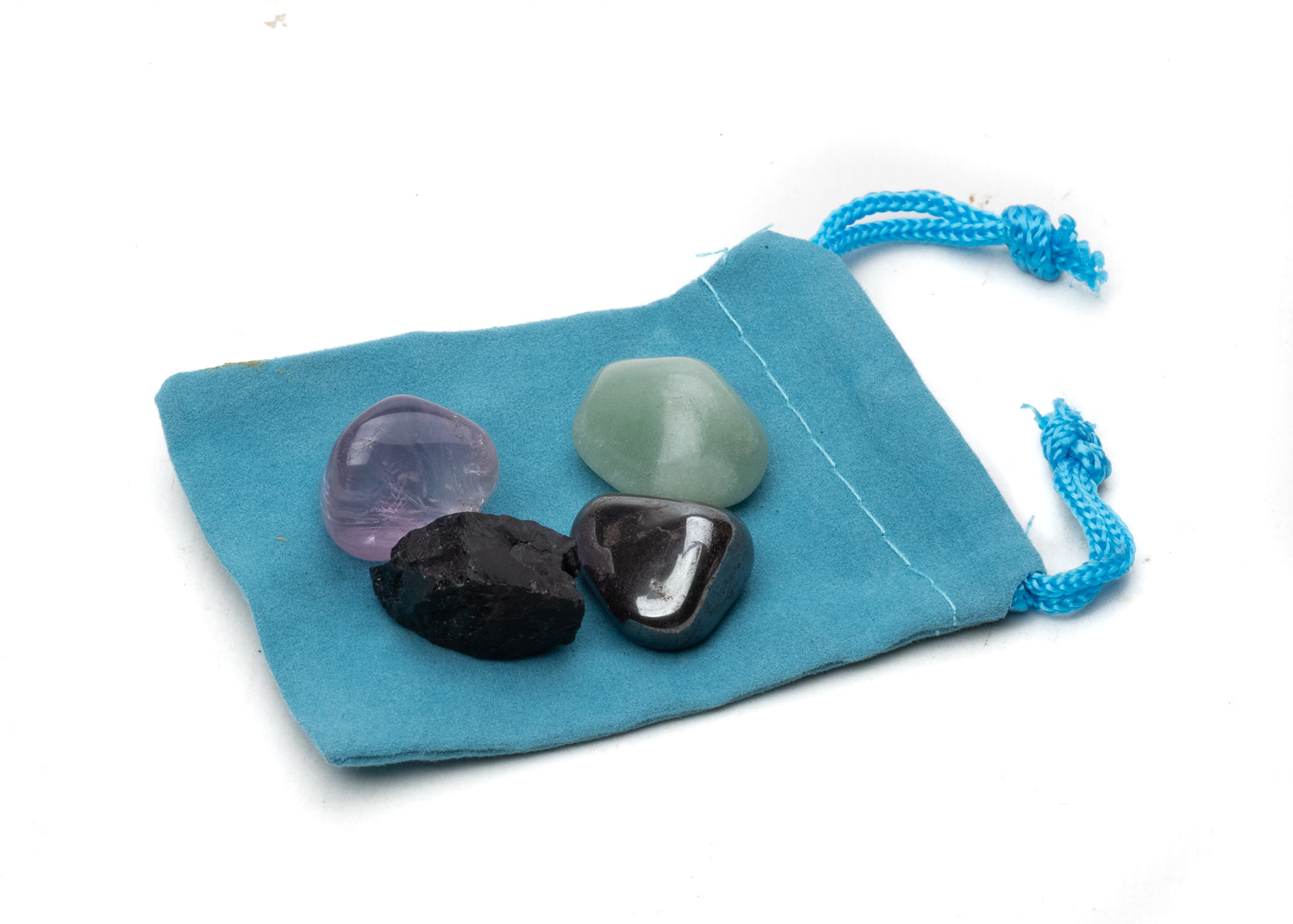 Four Piece Crystal Collection with velvet pouch. Stones: Black Tourmaline, Hematite/Shungite, Amethyst, Green Aventurine. Color of the velvet pouch will vary.