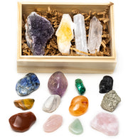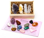Each kit includes: Selenite Stick, Clear Quartz Point, Raw Rose Quartz, Rose Quartz Tumbled, Amethyst Druze Cluster on Basalt, Amethyst Tumbled, Red Jasper Tumbled, Carnelian Tumbled, Tiger’s Eye Tumbled, Green Aventurine Tumbled, Sodalite Tumbled, Howlite Tumbled, Raw Pyrite, Raw Black Tourmaline, Malachite Tumbled, Raw Citrine and an information sheet about the crystals.