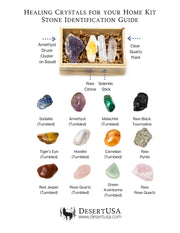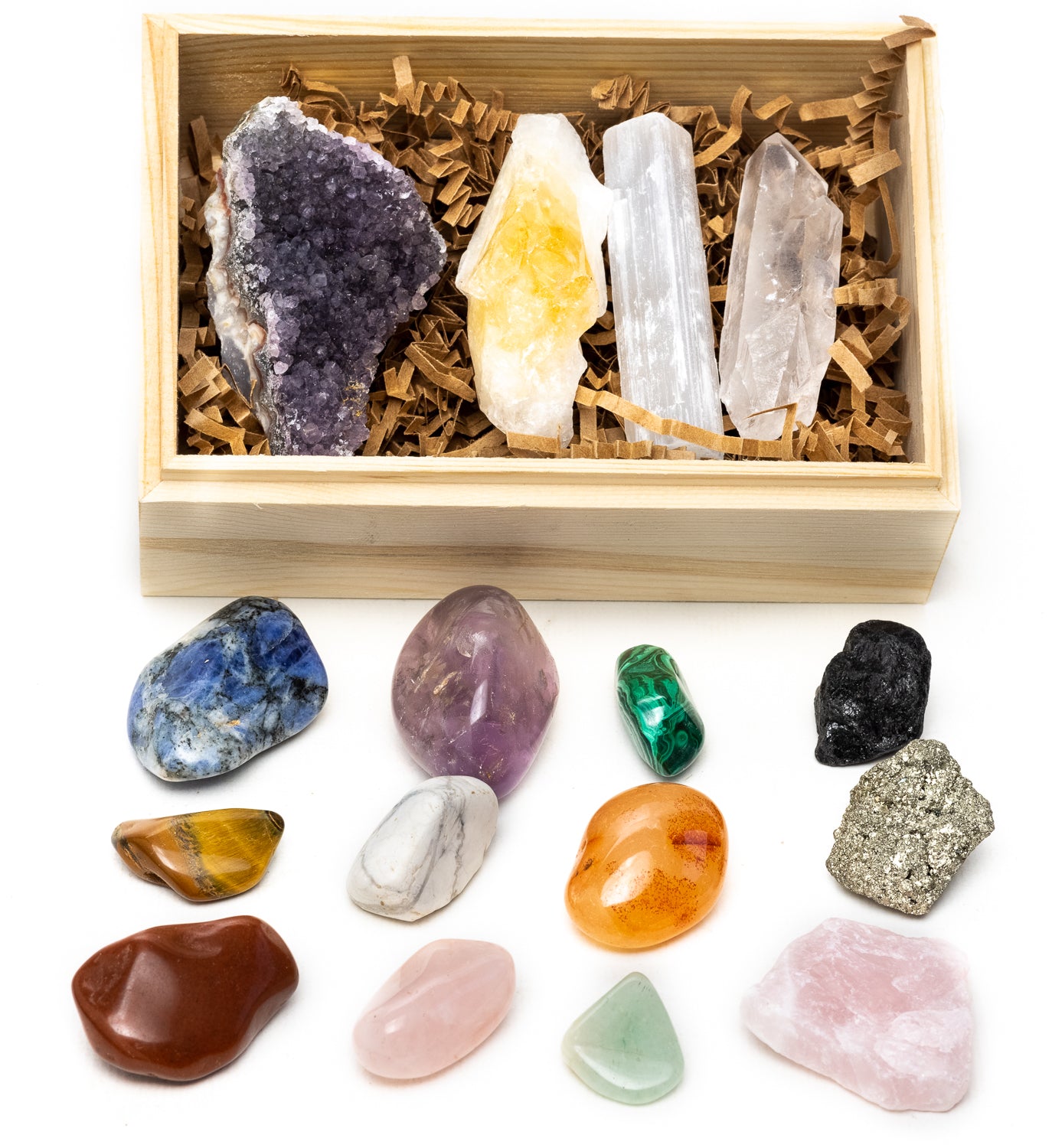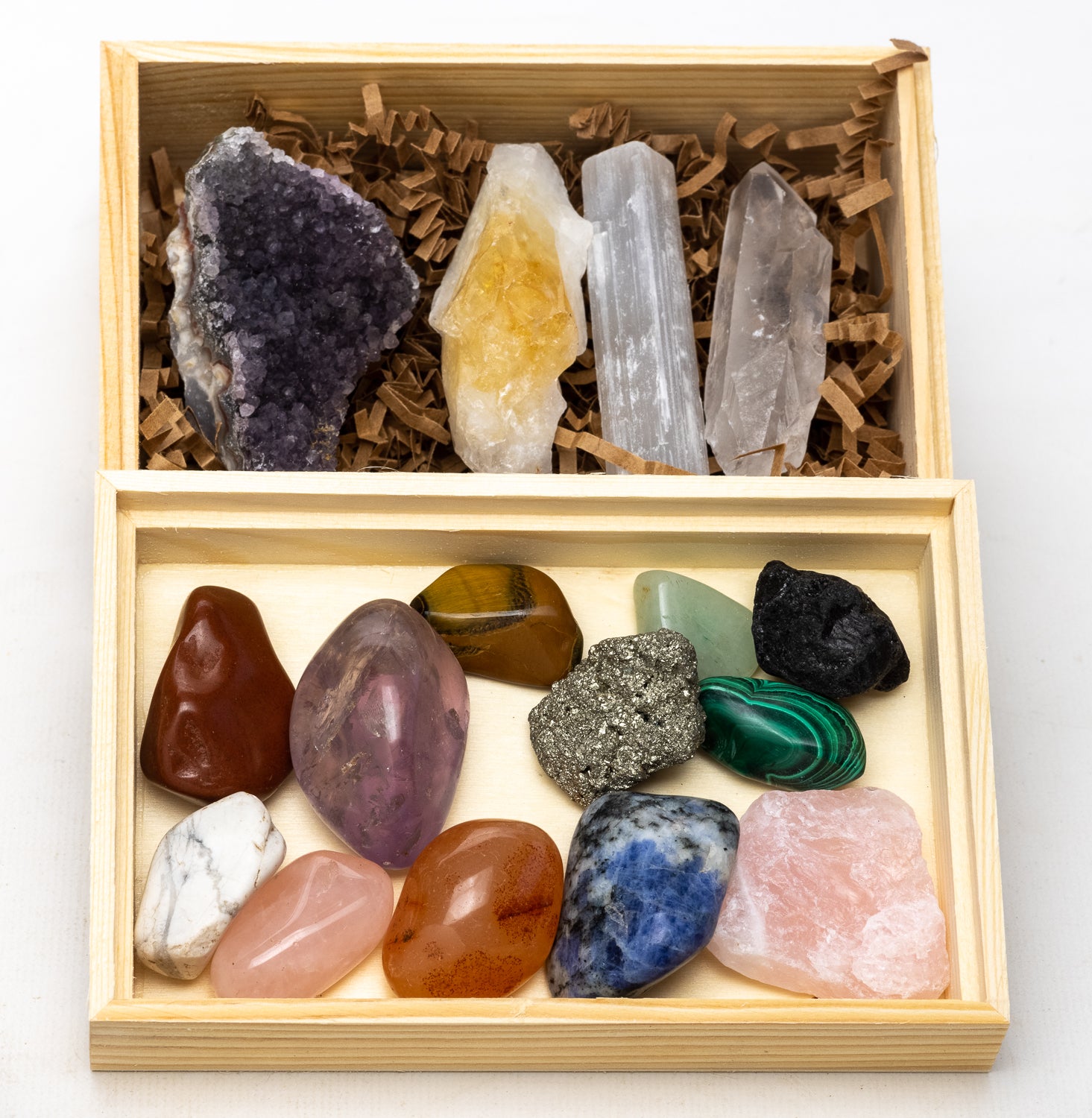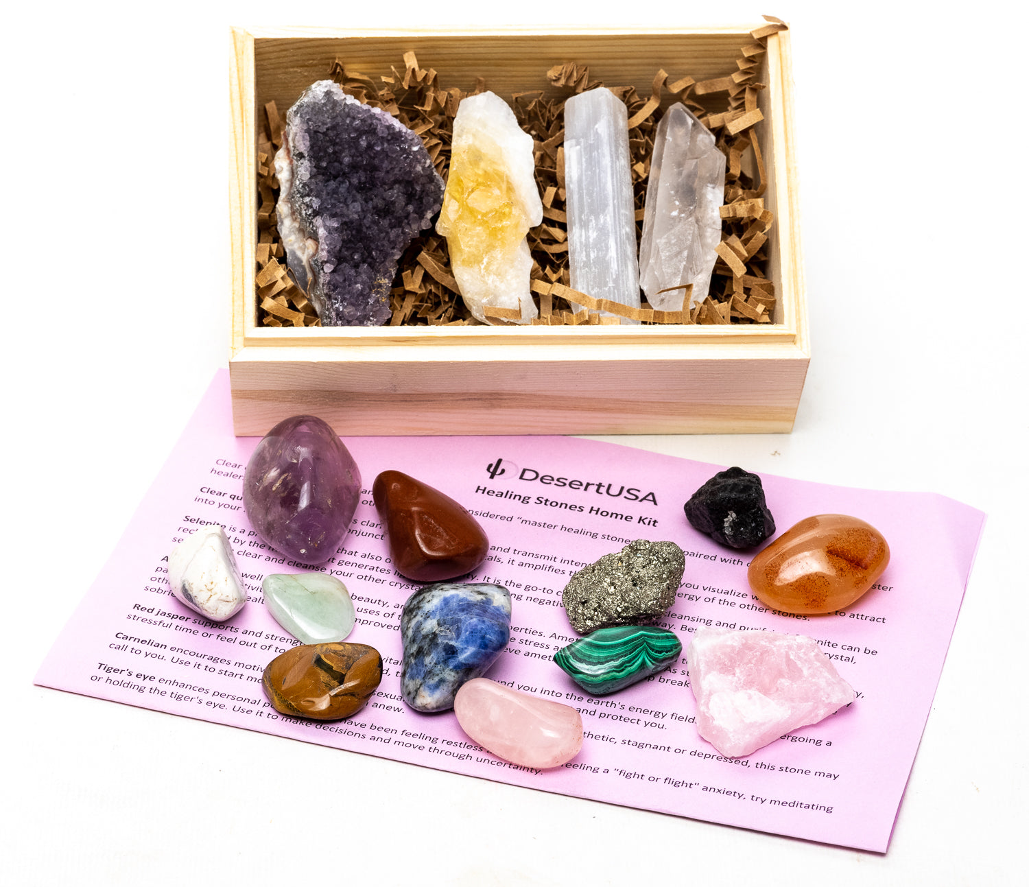 DesertUSA's Healing Crystals for Your Home Starter Kit includes 16 unique crystals: 7 raw crystals and 9 tumbled stones carefully packaged in a wooden box with a lid.