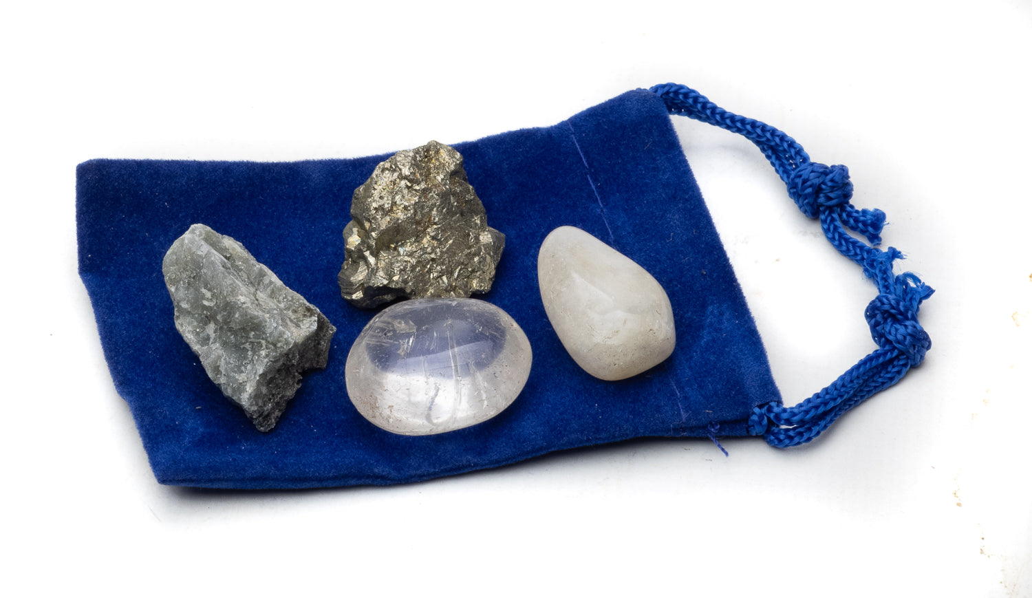 Prosperity Collection stones with velvet pouch. Stones: Citrine, Clear Quartz, Pyrite, Green Aventurine. Color of the velvet pouch will vary.