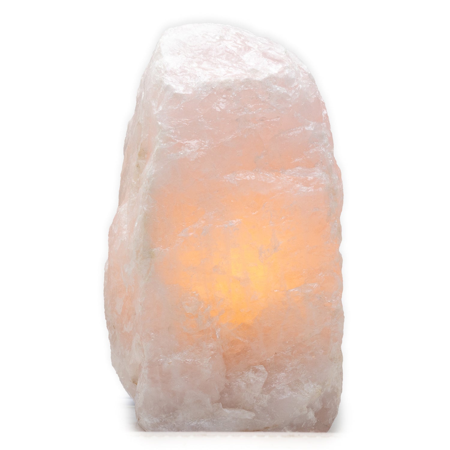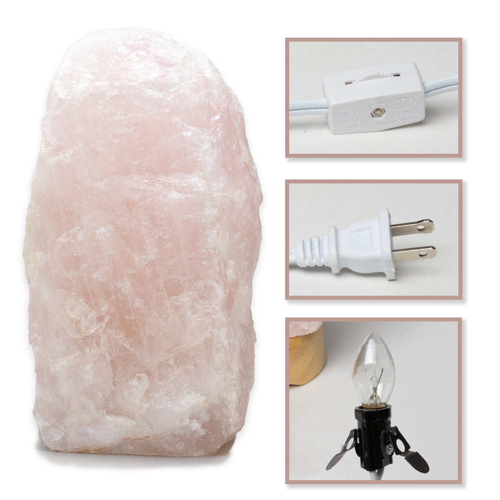 Natural Rose Quartz Lamp These stone lamps are Rose Quartz with a light inside. The light bulb and cord are included. The total light base and store is approximately 6" to 7" High by 3" Wide. The light is inside the stone - 115 volts.